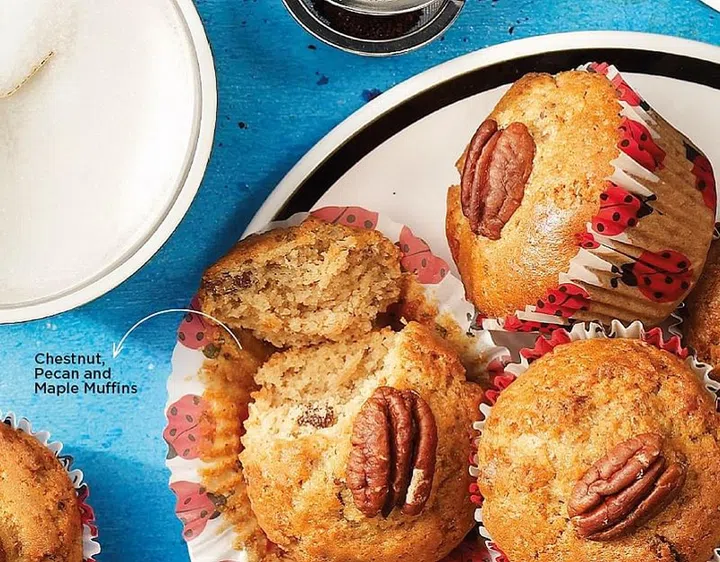 6 With an ice cream scoop, transfer a generous amount of batter into each muffin case. Top with one whole pecan each. Bake for 20-25min, or until a skewer inserted into the centre of each muffin comes out clean.