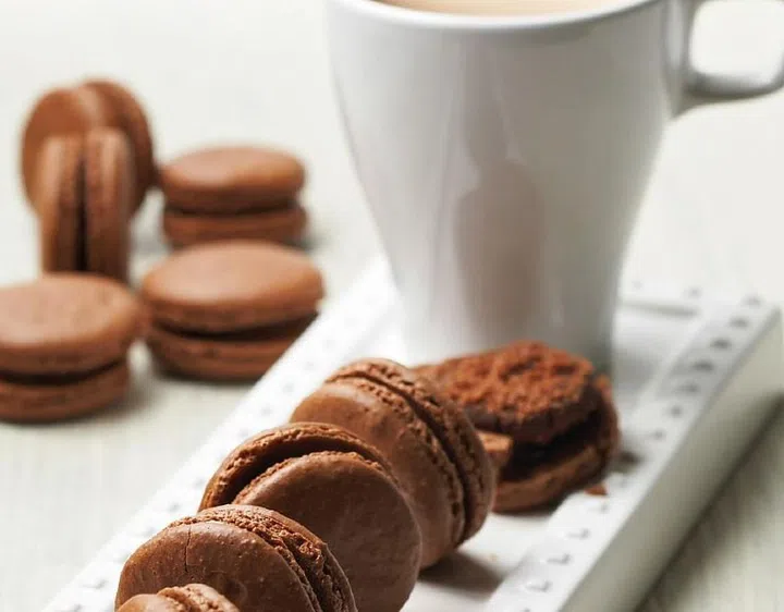 5 Beat the ganache in a mixer for 2min until it’s soft. Spread on both halves of two macarons. Sandwich the two halves together and refrigerate for at least 12 hours before serving.