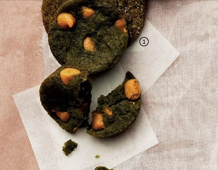 4 Mix the all-purpose flour, baking soda, green tea powder and salt. Sift the mixture, then add it to the dough and mix lightly. Add the butterscotch chips.