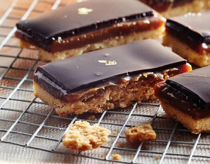 8 Pour the caramel evenly over the shortbread. Leave to cool at room temperature and freeze for 2 hours to set.