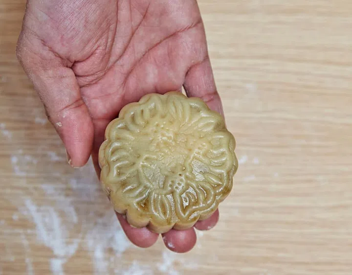 TIP Each mooncake should fit the mould exactly or it will come out misshapen. Too big? Pinch off the excess and roll it back into a smooth ball before pressing it into the mould again.