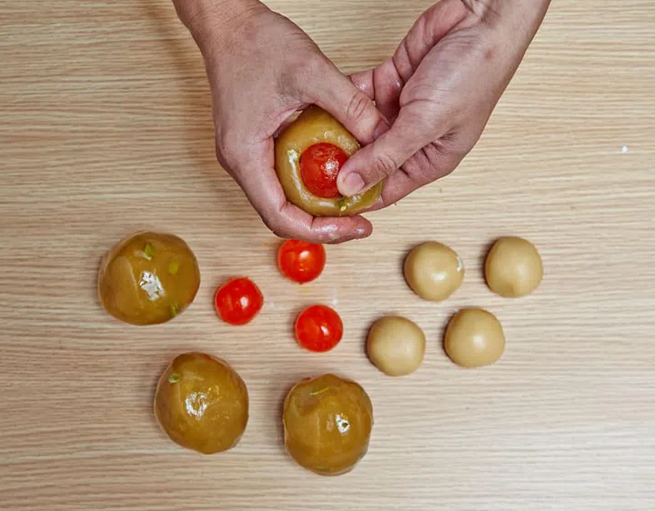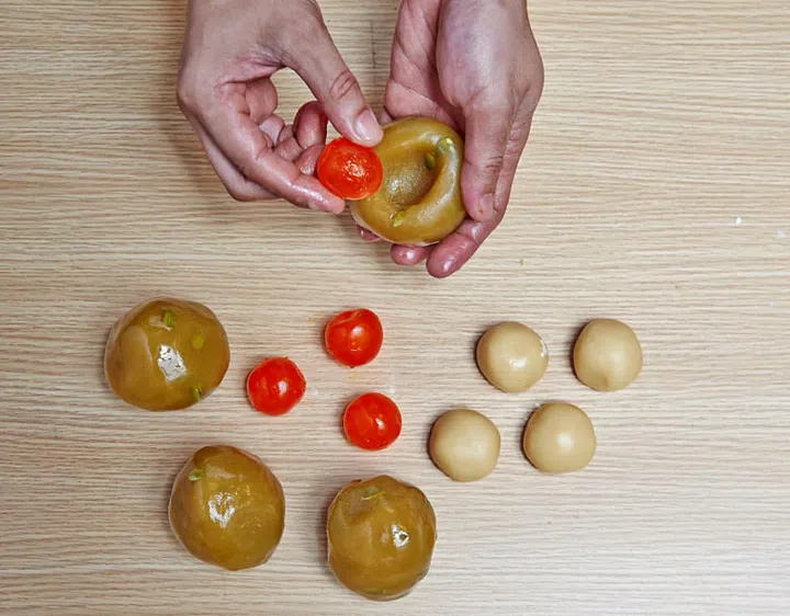 7 Press your thumb into the centre of each ball to make a well and place a salted egg yolk in it.