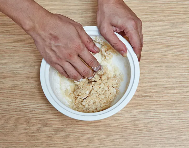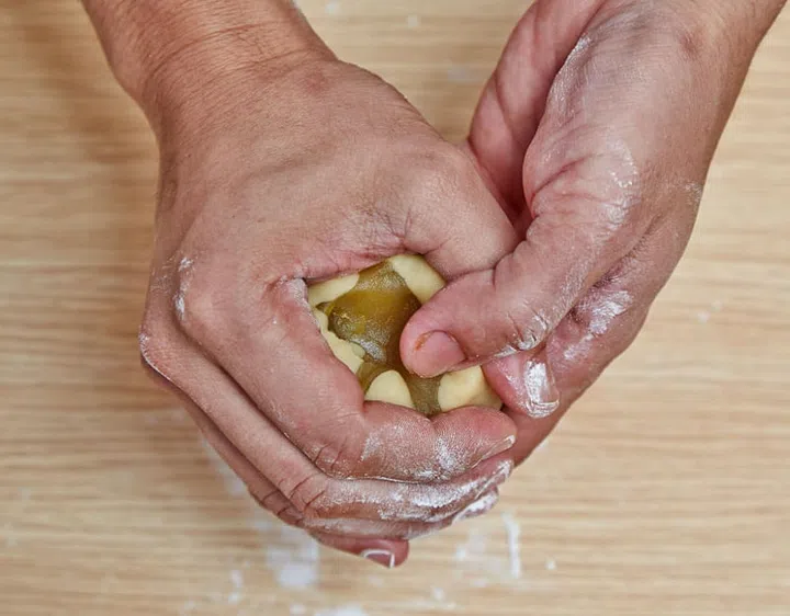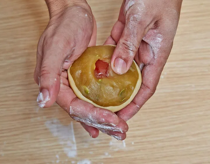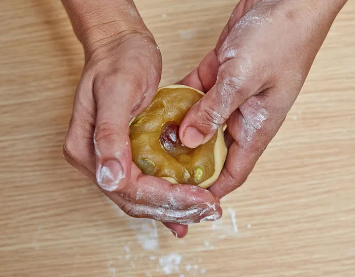 11 Hold the mooncake in your left hand and gently push down the filling.