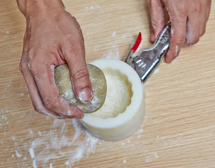 13 Dust the countertop with flour and roll the mooncakes on it to lightly dust them. Place each one into a mooncake mould*, cover and press down.