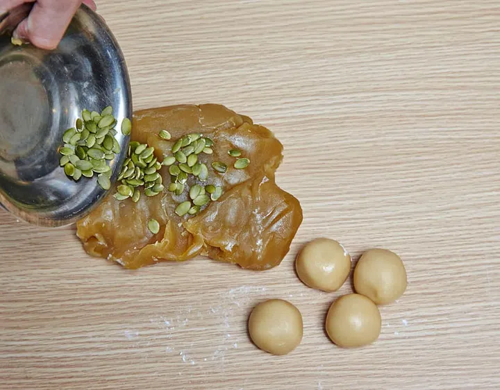 On a clean countertop, knead the pumpkin seeds evenly into the lotus paste. Then roll the paste into a log about 5cm thick.