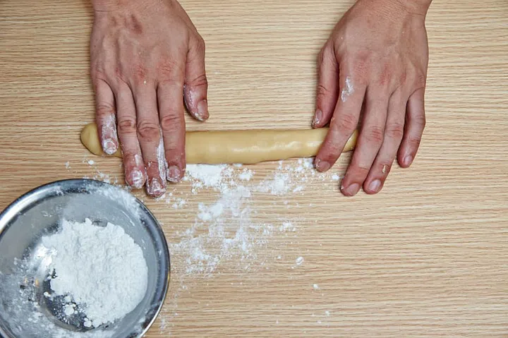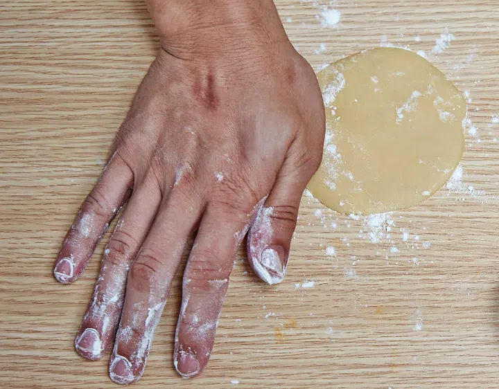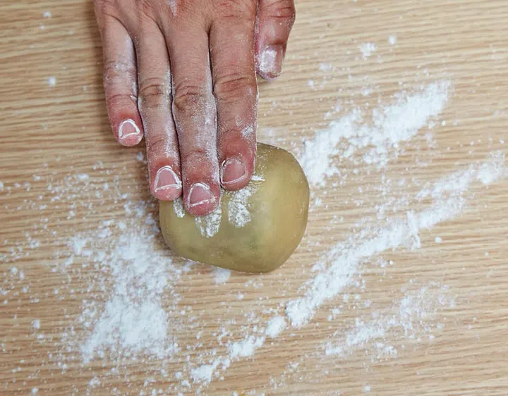 On a countertop dusted with flour, use your palm to flatten a ball of dough into a circle. Use a bench scraper or butter knife to transfer it to your palm. The circle should be about 1.5cm wider than the ball of filling.
