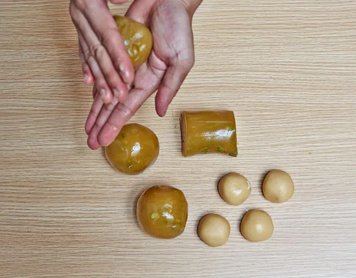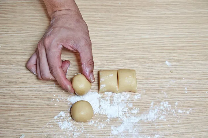 Divide into 4. Each piece should be about 25g. Pinch off any excess and shape into a ball. Set aside.