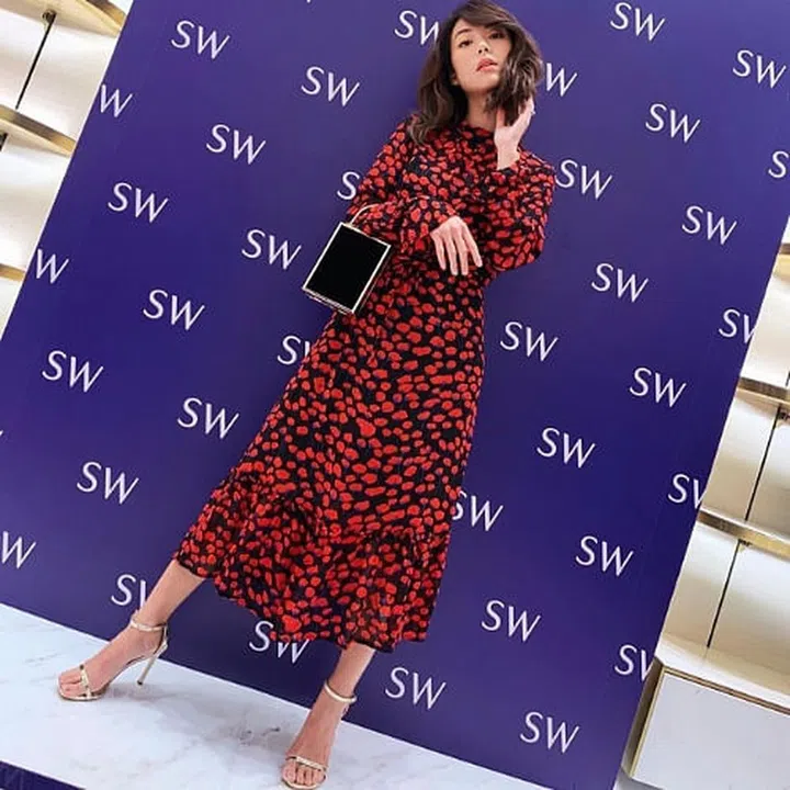 A red floral printed dress can look a little matronly. But you can easily refresh it by matching it with a pair of gold strappy sandals and a quirky top handle evening bag, just like how Andrea Chong did over here. With the right accessories, you can instantly inject a dose of sass into your ensemble. Finish the look off with a pair of statement hoops.