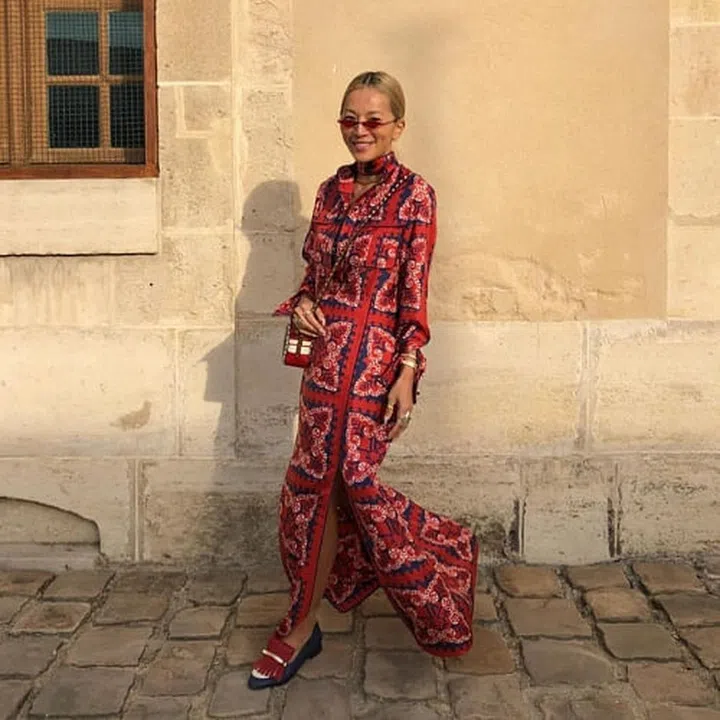 If you’re afraid to don a full red outfit (we know, it can be intimidating), try complementing the bold hue with splashes of blue and white. Over here, Tina Leung show us how to mesh these three colours well, by rocking a printed maxi that has splashes of all three hues with a fancy pair of leather brogues and crossbody bag. Lose the sunglasses and neck scarf — you wouldn’t be needing them if you’re indoors most of the time.