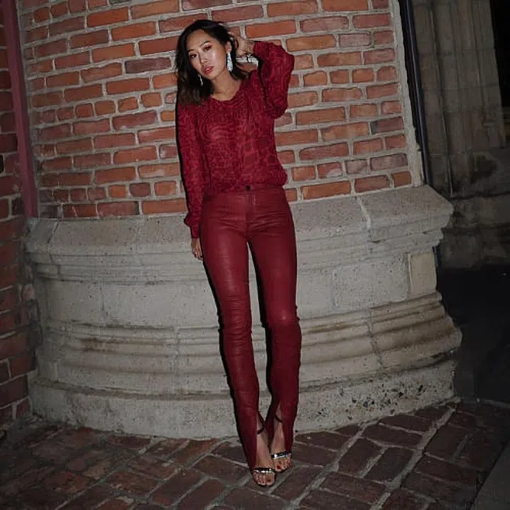 For something really eye-catching, let your top and bottom be of the same hue, preferably something vibrant. Aimee Song went with a leather print long sleeve blouse and dark red pants, but if animal print is not your thing, slip into a maroon pullover and a pair of trousers or an A-line skirt in a matching shade. Jazz up your ensemble with a pair of earrings and some black strappy heels.