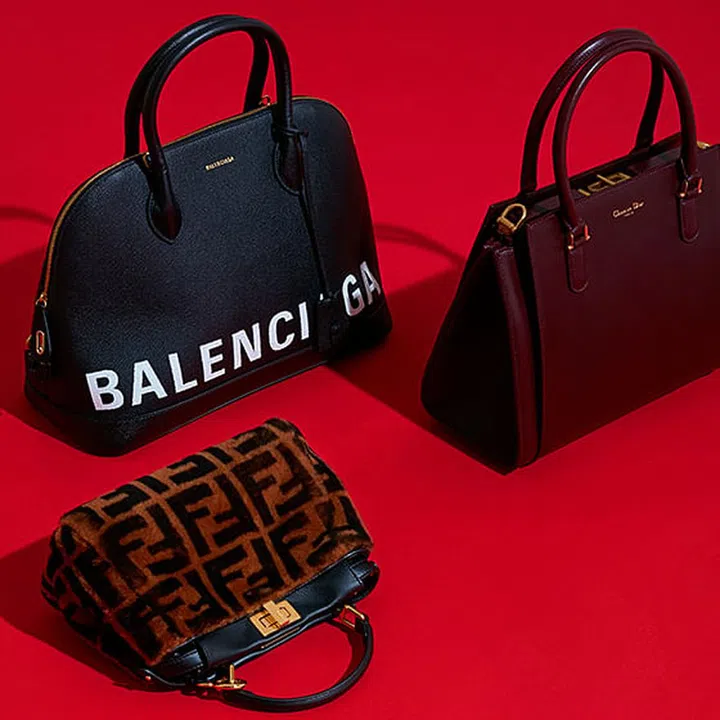 From top left: Ville medium calfskin bag, $3,300, Balenciaga, Dior21 lambskin tote bag, $6,600, Christian Dior and Mini Peekaboo in shearling (price unavailable), Fendi.