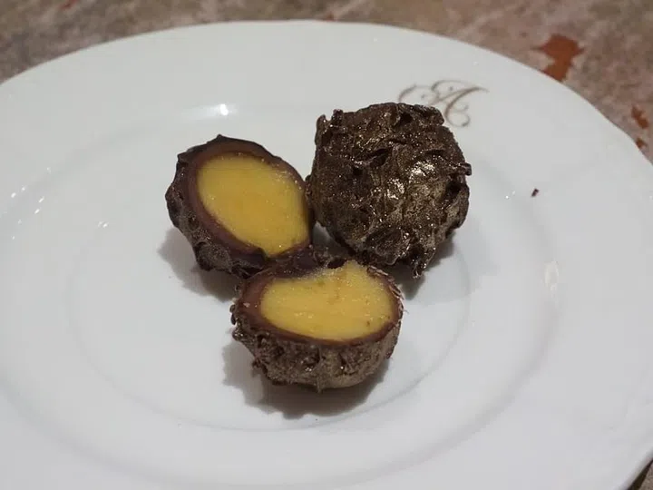 You get a whole, custardy ball of salted egg yolk in a gold-dusted dark chocolate shell. We loved the gau salty hit, and frankly, we were glad that this doesn't try to be another oozy salted egg yolk lava item.