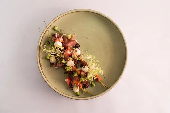 This pretty starter is a kaleidoscope of colours with oven-roasted carrots, serrano ham, strawberries, capers, feta cheese, quinoa and little florets of broccoli dressed in a mixture of 55 per cent chocolate with balsamic vinegar and olive oil.
