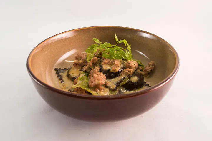 Almost as if to prove a point, that the chocolate element in savouries doesn't always have be in the sauce, chef Pang turns our misconceptions upside down with this chocolate ravioli.