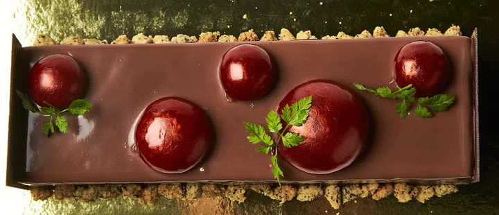 A juxtaposition of contrasts! Pickled cherries cut through the rich dark chocolate ganache and mousse, while beads of chocolate-coated biscuit added crunch to the soft chocolate chiffon sponge.