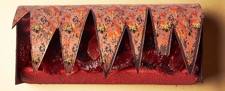 Don’t be daunted by the architectural lines. The cross-section revealed concentric rings of thick, dark chocolate ganache and pillowy, Viennese cocoa Swiss rolls. The shards surrounding the log added an intense chocolate hit.