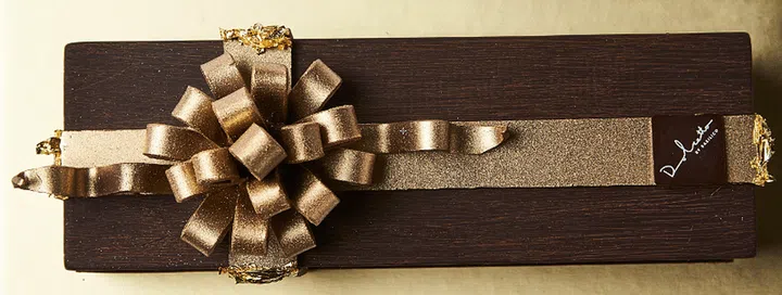 The edible "gift box" was made from tempered Amedei chocolate, its harder texture perfect for noshing on like a other chocolate bar, and housed the real chocolate cake ─ crunchy Guanaja dark chocolate feuillettine base layered with more Guanaja dark chocolate in mousse form, a jammy Morello cherry confit, Amaretto-laced praline cream, and a maroon coat of cherry glaze.