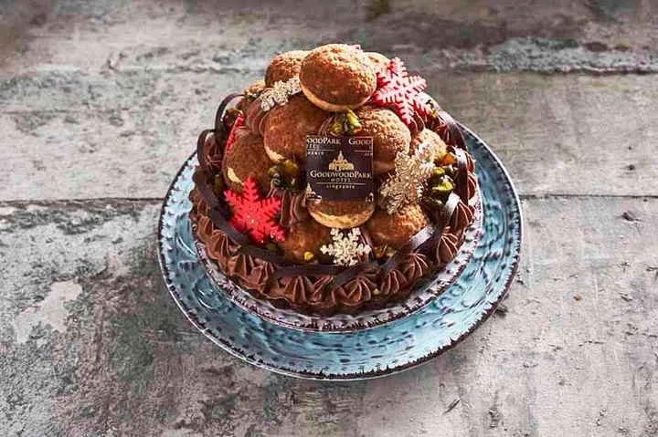 We want this croquembouche-meets-chocolate tart dessert for every celebration! The profiteroles, piped with a whiskey custard, were artfully arranged on a base of chocolate hazelnut cream, chocolate sponge, and Oreo crust.