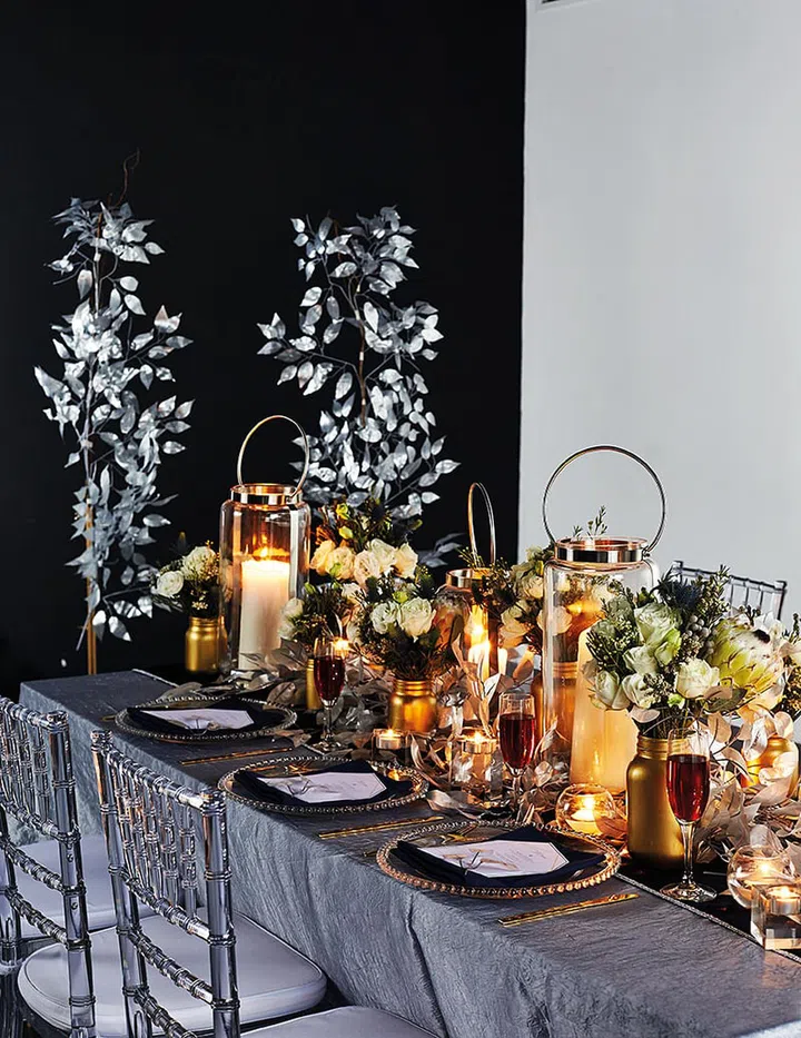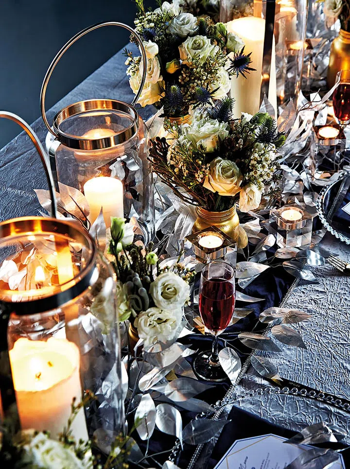 Turn up the decadence with glamorous gold and dark blue hues. Add on the glam with different-sized candles in gleaming jars and fill the table with glass, gold and brass accessories.