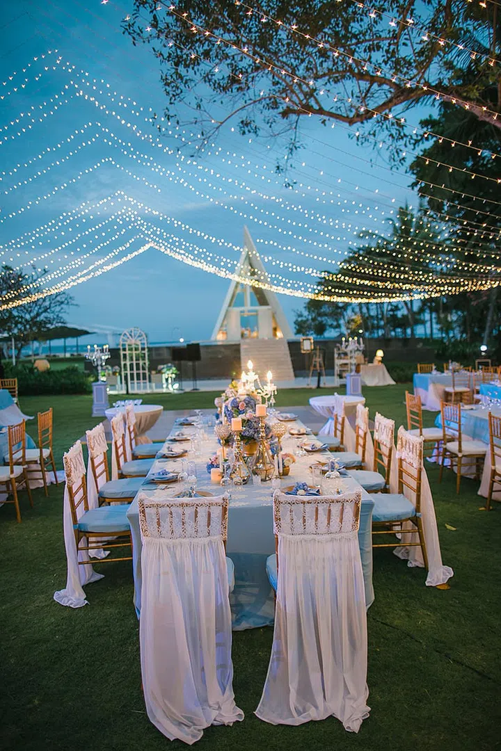 Lace-covered chairs, lush centrepieces, pretty signs and twinkling fairy lights gave this Bali dinner reception an air of romance. The couple also opted for a dusty blue, blush, cream and gold theme to complement the natural beauty of Bali.