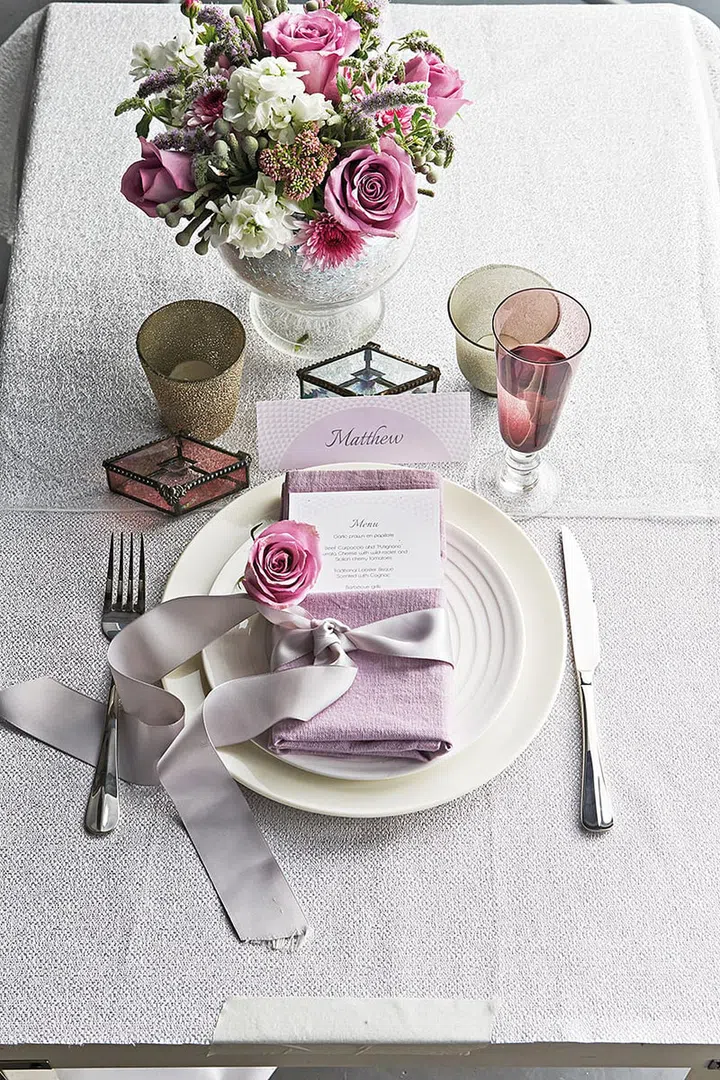 Varying shades of lilac and lavendar with silver accents is the main theme of this simple and refined set-up. Complement them with unique glasswares.