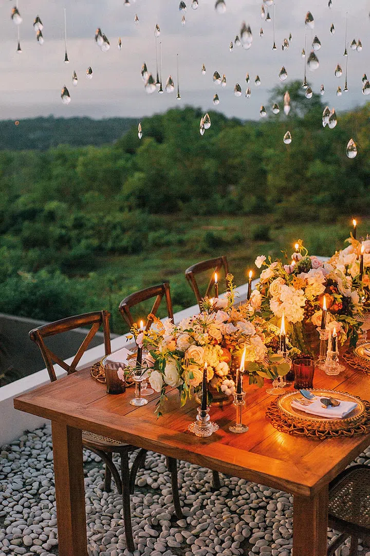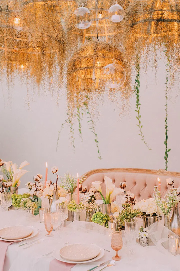 Lush, luxe and gorgeous, imagine a dark, romantic rainy night with twinkling crystals. Raw wooden and ratten furniture is dressed up with gold-beaded charger plates, bronze candles and a clever mix of blooms in warm, muted shades of blush, ivory and white. Candles and tea lights added a warm burnished tone to the furniture and surrounding greenery.