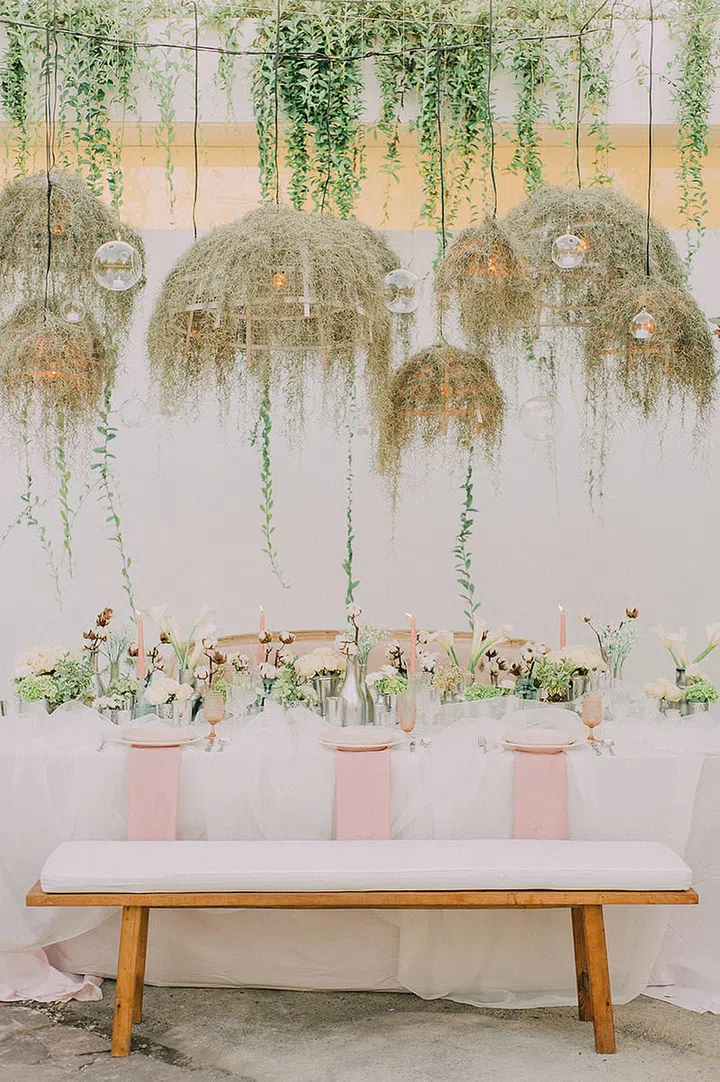 Charming furnishings with raw, wooden accents are complemented with mixed foliage and fruits with delicate blooms. The finish: A delightfully whimiscal occasion that's relaxed and romantic. Stylist Artika Sulaiman also laid the table with tulle for a soft, sheer texture and arranged an assortment of flowers and greenery in burnished steel vases alongside candles and tea lights.