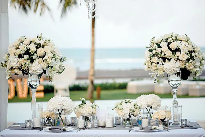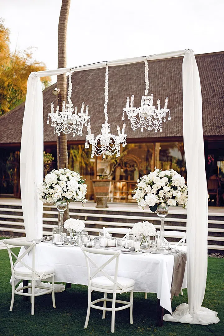 This cool and chic setting works beautifully for day, dusk or night celebrations. Keep it simple and stylish with white and off white as your main colour theme and add in touches of silver. Balance out resort elements like rustic furniture with more elegant accents, such as flowers and chandeliers.