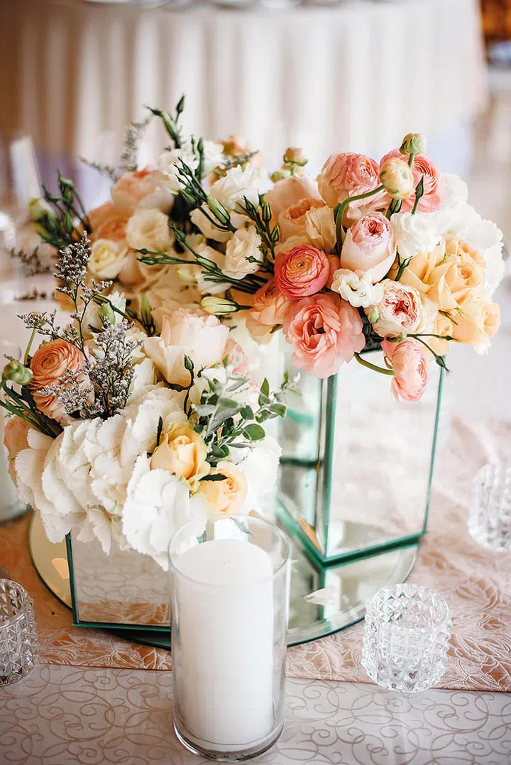 You can never go wrong with pastel blooms with gold silverware. The theme was floral romance and the couple went with pastel shades such as with peach, pink, cream, lilac and sage for their blooms and table decorations.