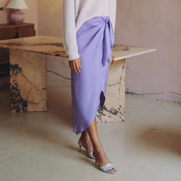 An instant favourite is this lilac coloured satin skirt that features a flowing silhouette and a flattering non-elastic waistband – an essential feature on a bias cut skirt which helps skim the waist as compared to elastic bands.
