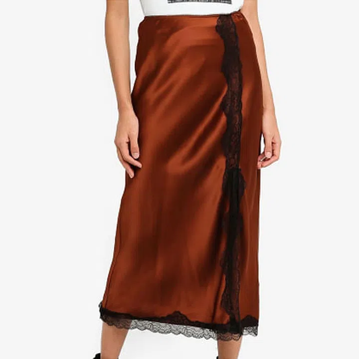 Trimmed with lace, this mid-rise brown satin skirt from Topshop can be dressed up or down for any occasion as deem fit.