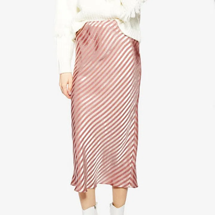 Featuring taupe and beige stripes that run diagonally to the bias cut, this midi skirt is a polished and sophisticated choice that will look stunning when paired with lighter coloured tops and shoes.