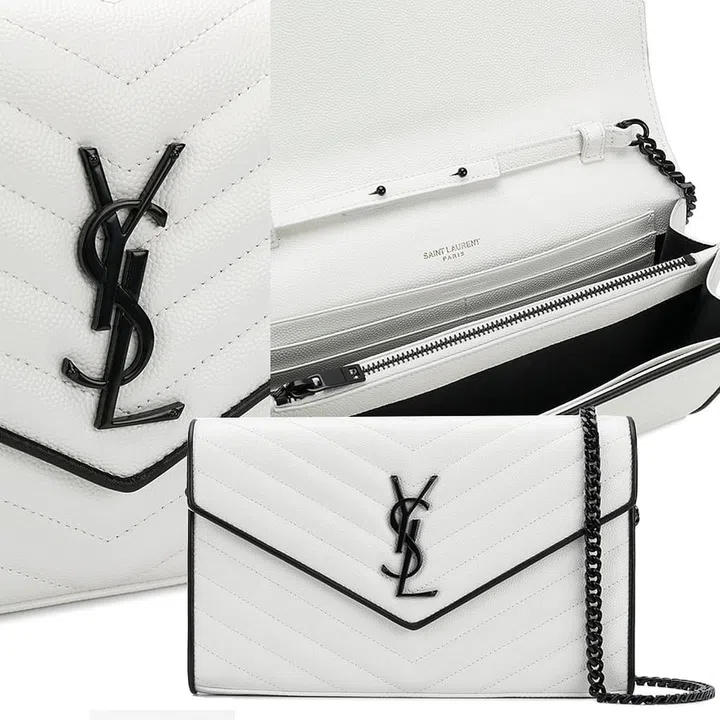 French luxury house Saint Laurent, most known for its rock-glam flair, revives its classic Monogram chain wallet with an all-white look and contrasting black trim.