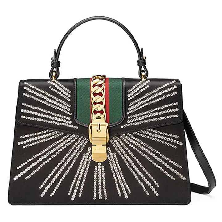 Made from shiny satin, the Sylvie mini top handle bag glitters from miles away. It is embellished with rays of sparkling crystals that radiate from the center buckle.