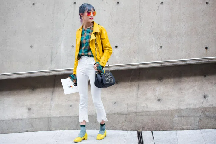 Everything about this getup is so on point – you wouldn’t think white, yellow and blue would gel well together, but this lady looks impeccably coordinated, no? We can’t decide which detail we love more: The long sleeves of her plaid shirt peeking out of her leather jacket more, or the cute pairing of socks with heels.