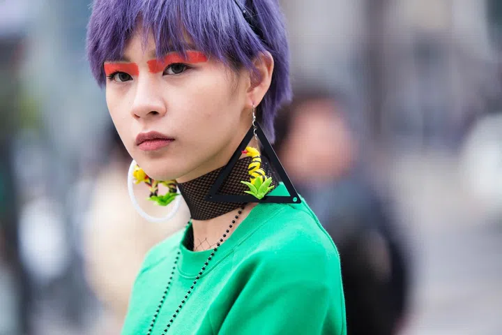 Wow, just look at all these colours! That neon band of coral is an out-there way of applying eyeshadow, and those funky statement earrings are definitely a head turner. Not forgetting, of course, that pop of green courtesy of her top. Not for the faint of heart.
