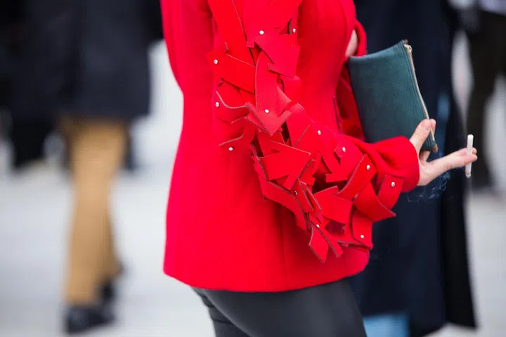 It’s all about the details, and we simply couldn’t take our eyes off this outfit’s sleeves with its intricate criss-cross arrow design bedecked with studs resembling nails. The volume lends the look a very architectural vibe, and need we say more about that sexy shade of red?