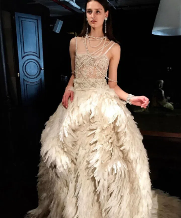 Nothing looks quite as fancy as a plumed skirt. A beaded cami-style bodice gives it a modern twist, while layers of pearls luxe it up.