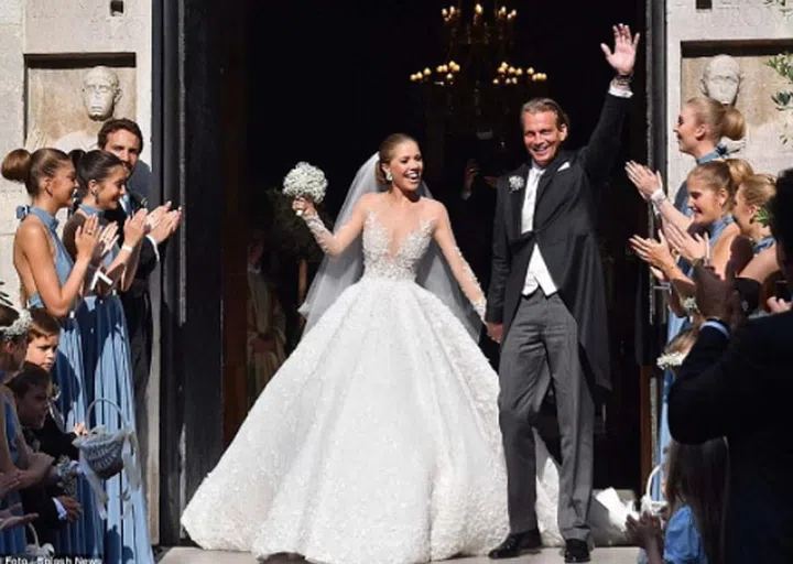Crystal heir Victoria Swarovski shone like a bride in more ways than one - her captivating gown was adorned with 500,000 Swarovski crystals.