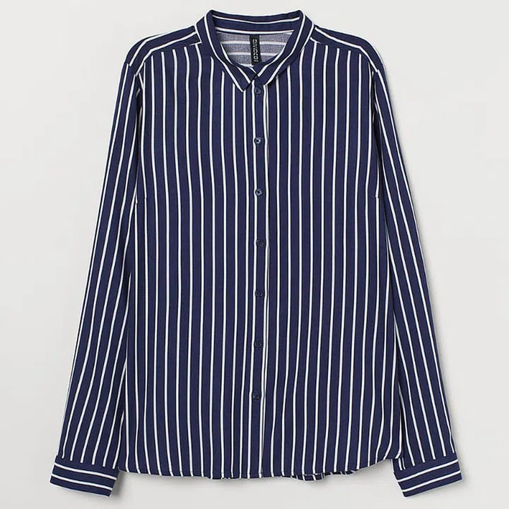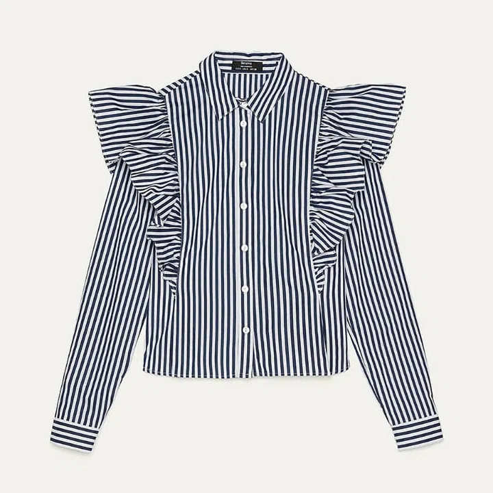 We love this shirt for the juxtaposition of vertical stripes with the unique ruffle trim.