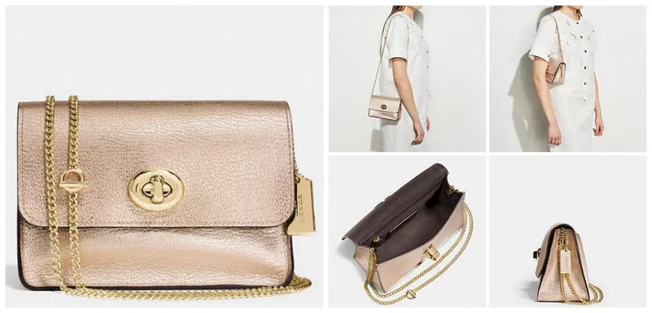 We love the refined leather calf finish on this adorable crossbody bag from Coach with just the right touch of gold and glamour.
