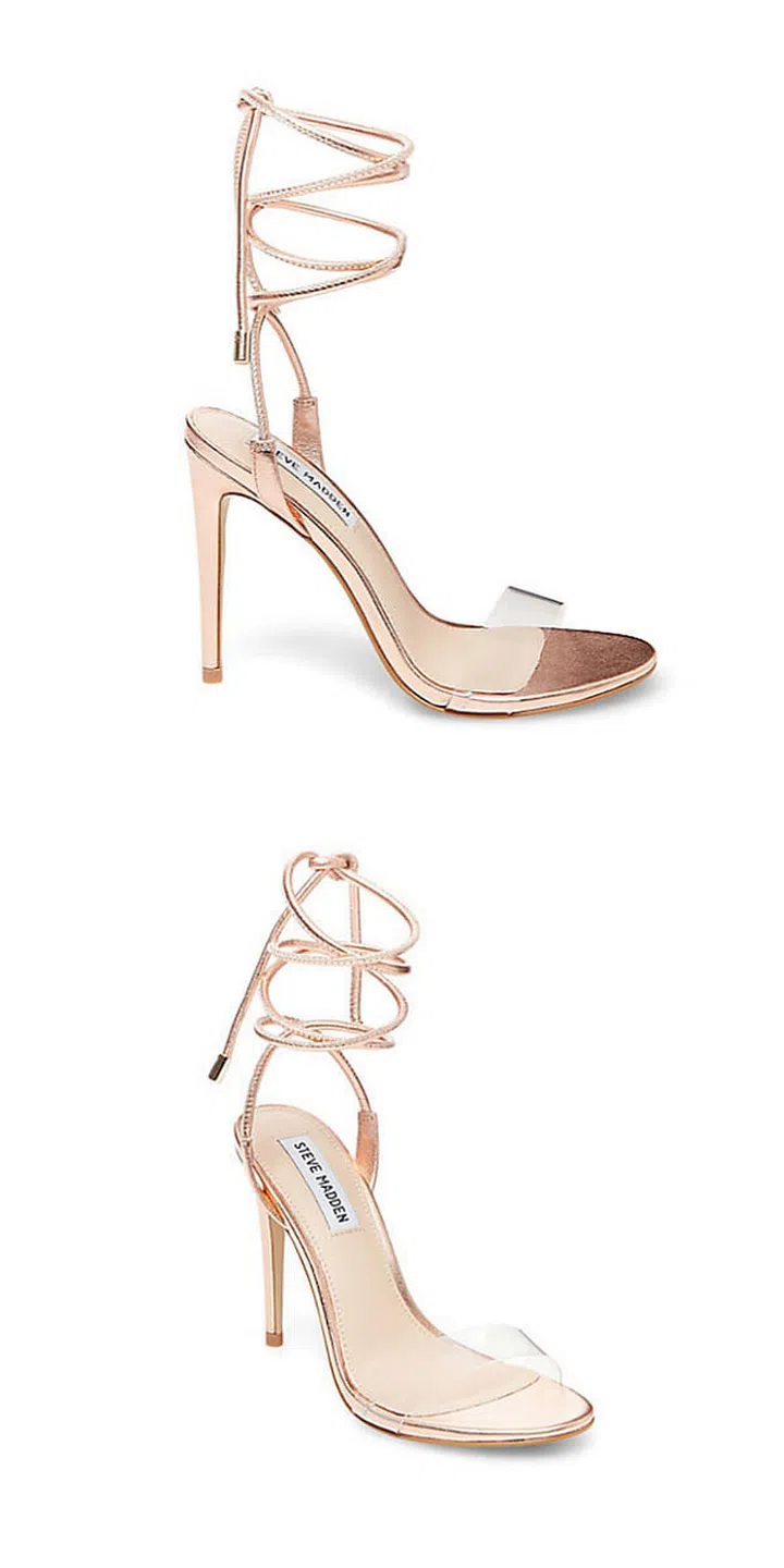 From its chic transparent toe strap to laced-up ankle straps, this seductive stiletto sandal in rose-gold is bound to amp up your look.