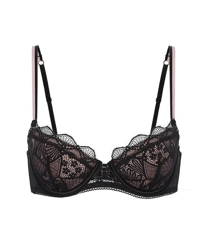 While UK brand Bordelle is usually known for its provocative, bondage-inspired lingerie, it tries for a more romantic touch with this red and blush balconette number, while retaining elements of its signature bondage aesthetic. This luxurious bra also features delicate Swiss embroidered tulle on the cups and bands, and 24K gold plated components.