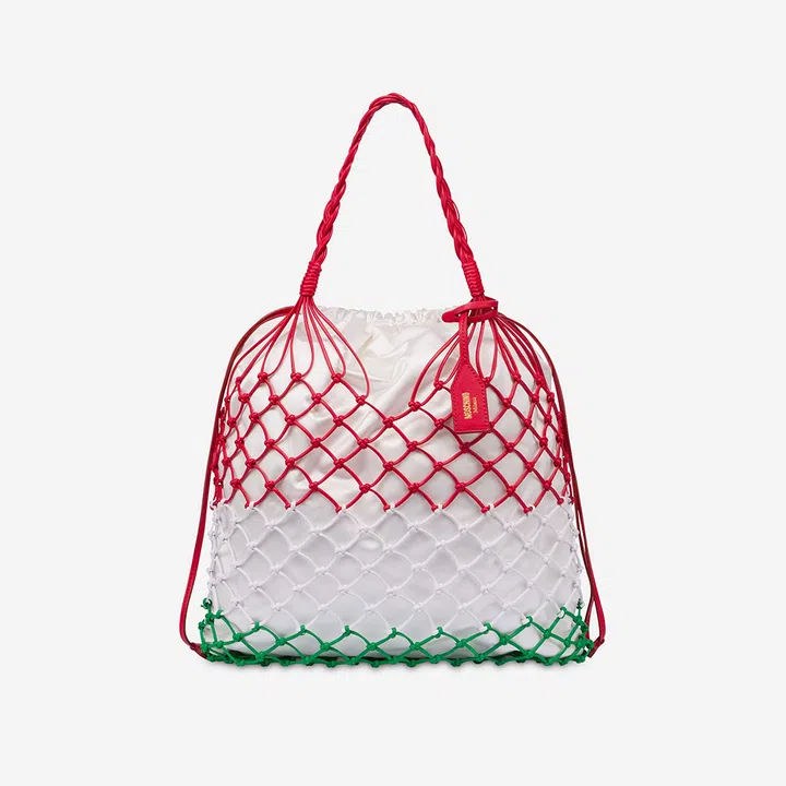 Reminiscent of the ‘shopping bag’, this basket net model boasts a unique tricolour texture with a rhombus motif, meticulously handwoven in delicate mignon knots.