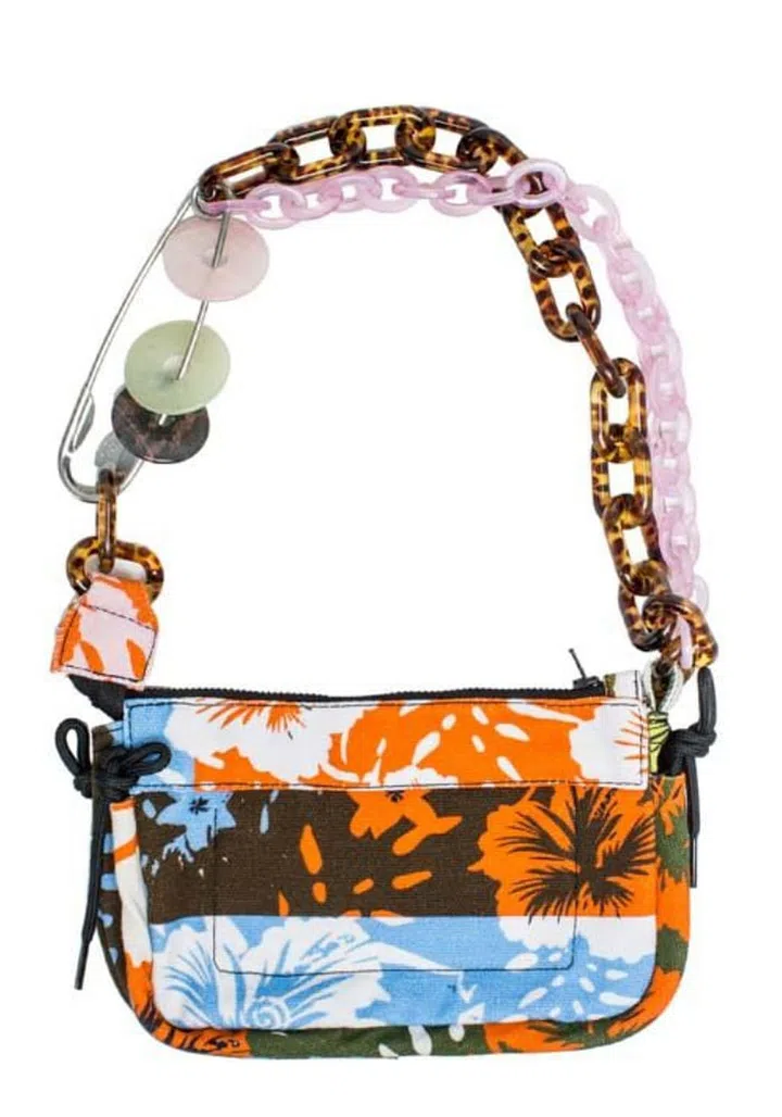 You’re going to be overwhelmed at first by the design of this bag (and we wouldn’t blame you), seeing as how it sports crazy Hawaiian prints, mixed coloured acrylic straps and a giant safety pin.