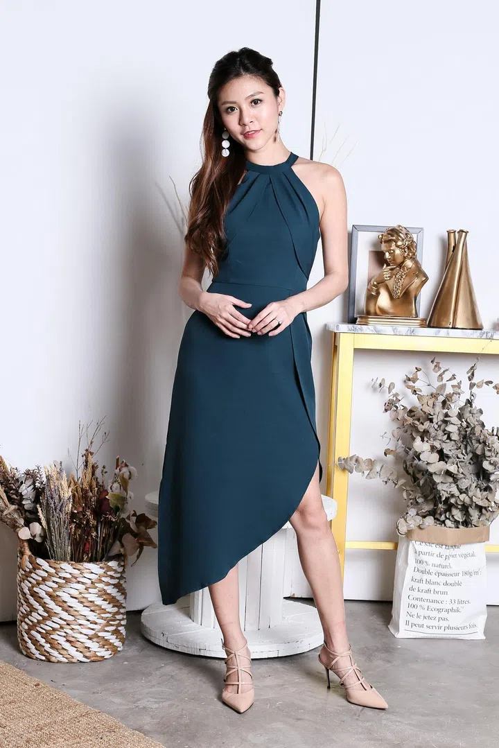 This glamorous halter asymmetrical dress is perfect for hotel ballroom weddings and comes in four different shades.