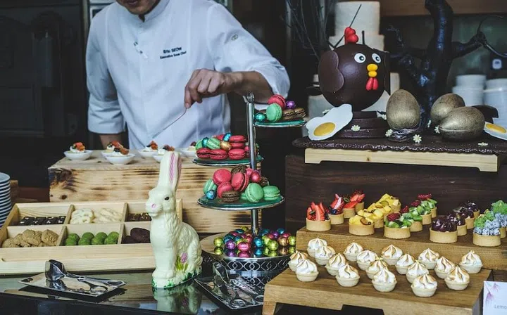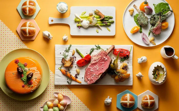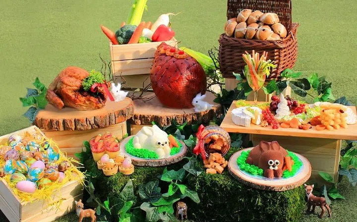 Round up the meal with some Easter-themed confectioneries including the Giant Chocolate Egg Tiramisu; Baileys Mousse; Orange Chocolate Fountain; Easter Rainbow Cake; Hot Cross Bun Pudding; Easter Pandan Cupcakes with Lemon
