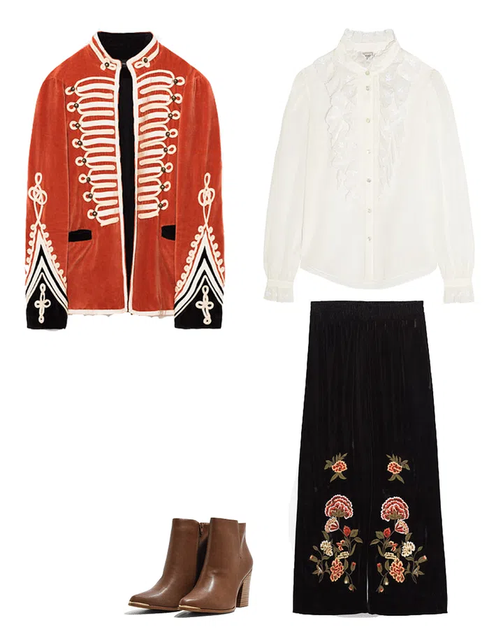 Zara Velvet Military Jacket, $159, Temperly London Etta Ruffled Shirt, $396 Zara Embroidered Velvet Culottes, $139
