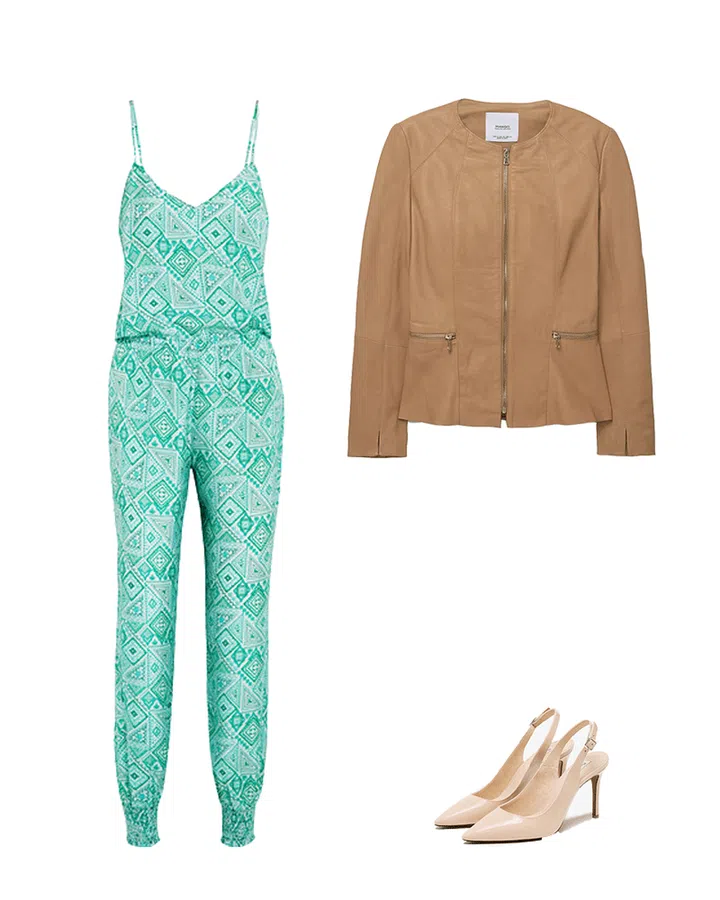 Paloma Blue Laguna Printed Washed-silk Jumpsuit, $272, Mango Zip Leather Jacket, $239, Massimo Dutti Nude Slingback Shoes, $165