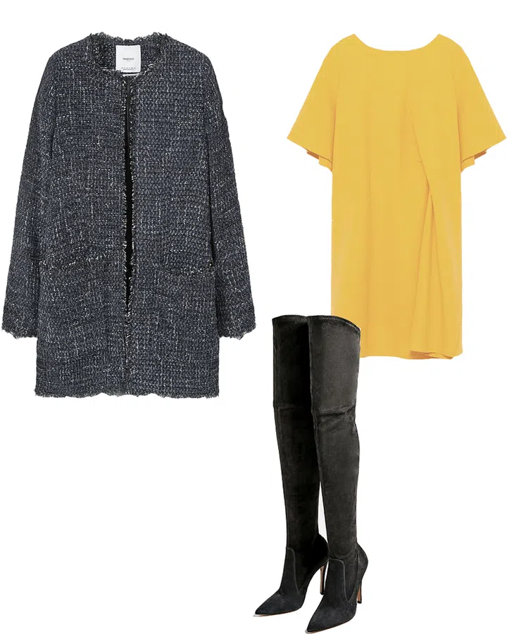 Zara Draped Dress, $119, Mango Flecked Cotton-blend Coat, $229, Zara Velvet Over-the-knee stiletto High Heel Boots, $319.